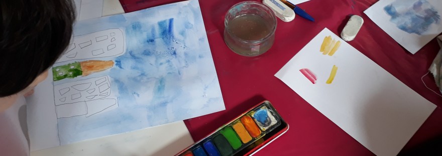 Durant cet atelier les parents et les enfants ont réalisé, à quatre mains, de gros nuages aux nuances de gris et de bleu (à l’aquarelle ou à la gouache), des maisons et immeubles colorés à l’aquarelle et aux craies grasses et enfin une pluie composée de traits multicolores et de confettis.